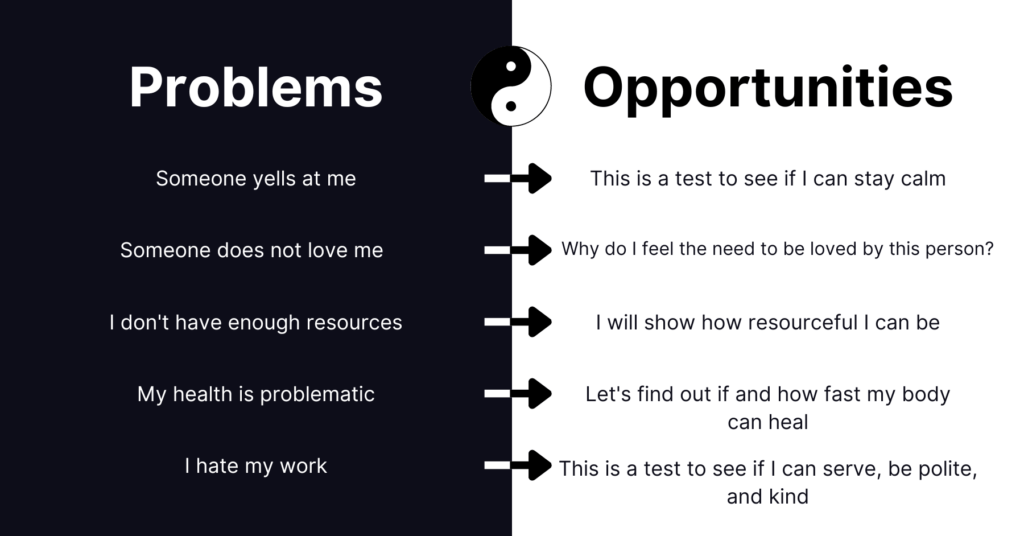 You can also simply reframe every challenge that you encounter as an opportunity for growth. You have enormous untapped growth potential. Every obstacle you meet is a new chance to practice your resolve.Â